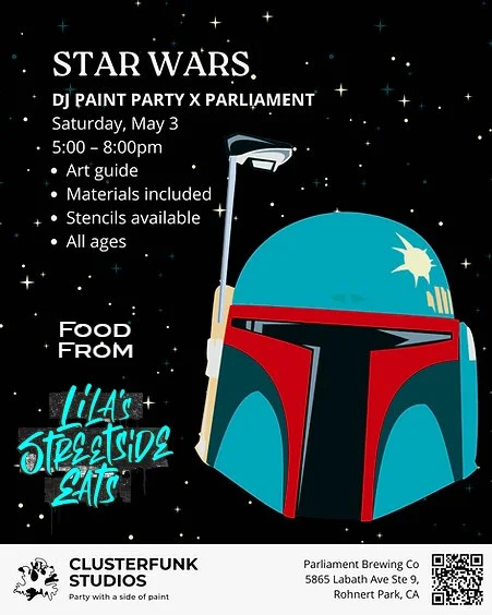Clusterfunk Star Wars Paint Night w/ Lila's Streetside Eats Saturday, May 3, 2025 12:30 PM 7:30 PM 12:30 19:30 Parliament Brewing Company 5865 Labath Avenue Unit #9 Rohnert Park, CA, 94928 United States (map) Google Calendar ICS @Lila’s Streetside Eats will be serving food from 12:30pm to 7:30pm or she sells out.